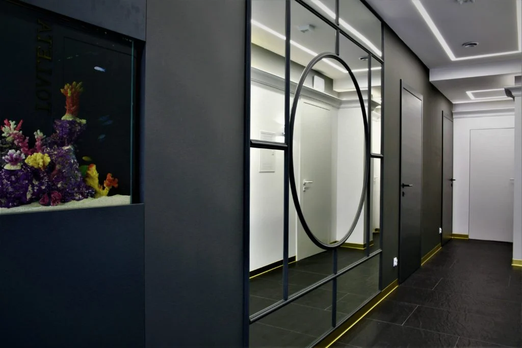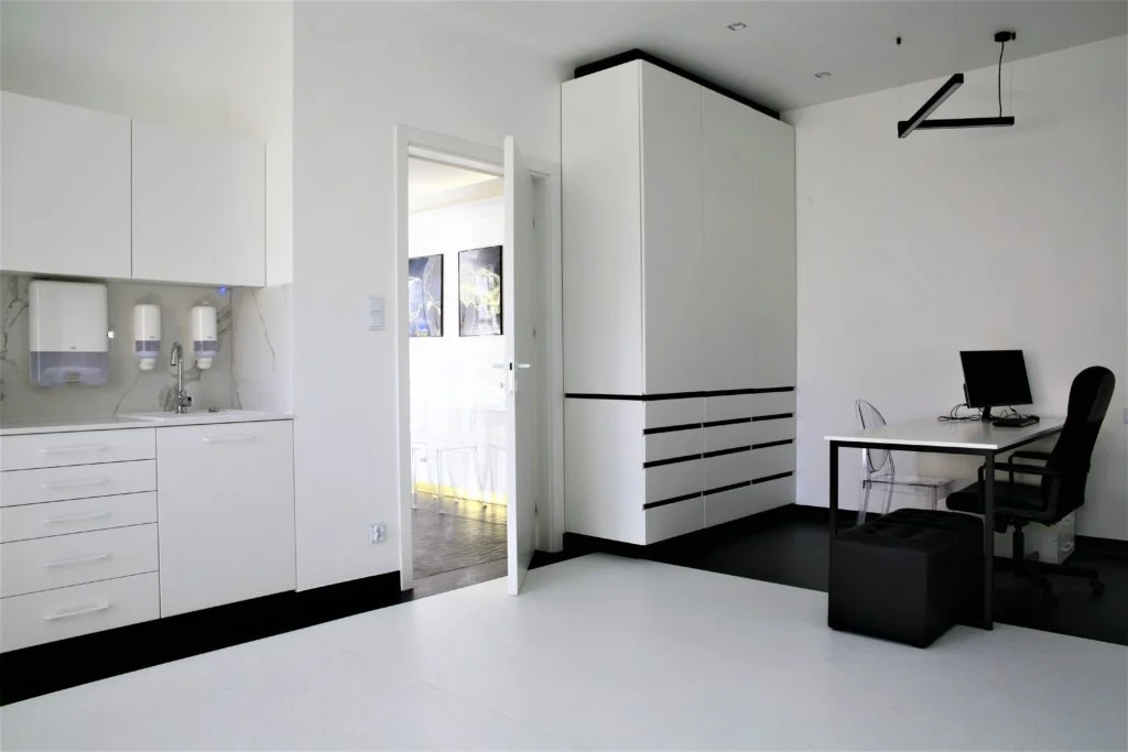 Efekt: powstała przestrzeń o wysokim standardzie wykończenia, w której nowoczesny styl łączy się z funkcjonalnością i komfortem. Gabinety są jasne, eleganckie i reprezentacyjne, zapewniając przyjazne warunki pracy dla personelu oraz komfortowe otoczenie dla pacjentów.